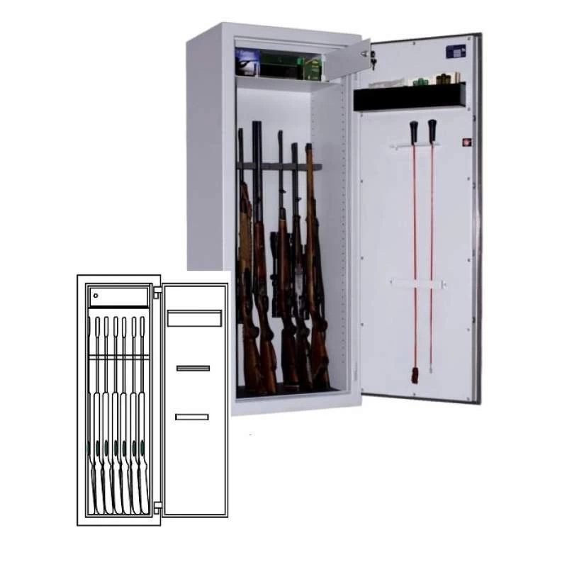 Im Inneren des Waffenschranks befinden sich ein Putzstock- und ein Waffenhalter sowie ein verschließbares Innenfach. Das Modell WSE150/80 bietet 2 Fachböden und 2 Innenfächer.