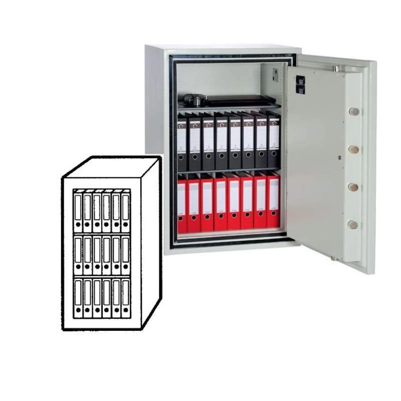 Serienmäßig besitzt der Tresor zudem eine Bohrung zur Ausführung eines Kabels für einen Körperschallmelder sowie eine EMA-Komplettausstattung. Die feuerbeständige Spezialbeton-Isolierung, der vierseitig umlaufende, doppelte Feuerfalz und die Palusol- und Litaflexdichtungen sorgen zudem für einen 30-minütigen Feuerschutz.