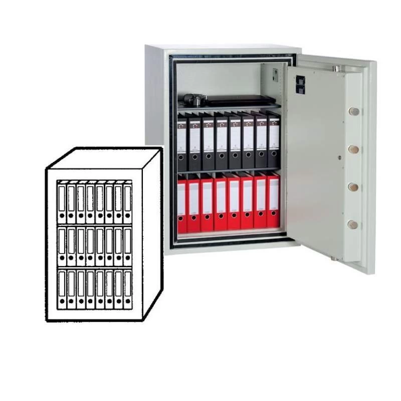 Serienmäßig besitzt der Tresor zudem eine Bohrung zur Ausführung eines Kabels für einen Körperschallmelder sowie eine EMA-Komplettausstattung. Die feuerbeständige Spezialbeton-Isolierung, der vierseitig umlaufende, doppelte Feuerfalz und die Palusol- und Litaflexdichtungen sorgen zudem für einen 30-minütigen Feuerschutz.