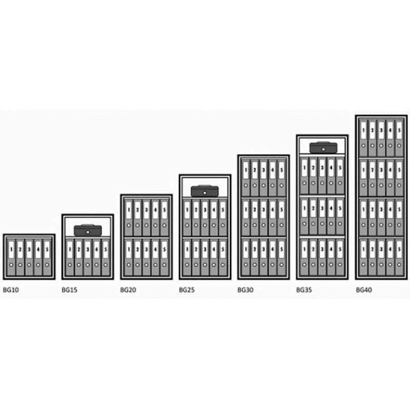 Die Tresore der Typenreihe BG von Wertheim überzeugen mit ihrer kompakten Größe und sind in mehreren Einrichtungsvarianten erhältlich. Der armierte Korpus ist bei diesen Tresoren mit einem höchst widerstandsfähigen Füllstoff versehen und entspricht damit der Sicherheitsstufe 2 nach EN1143-1. Je nach Ausführung bieten sie bis zu 20 Aktenordnern ausreichend Platz und verfügen über höhenverstellbare Fachböden.
