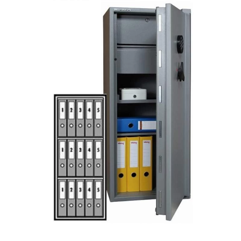 Die Tresore der Typenreihe BG von Wertheim überzeugen mit ihrer kompakten Größe und sind in mehreren Einrichtungsvarianten erhältlich. Der armierte Korpus ist bei diesen Tresoren mit einem höchst widerstandsfähigen Füllstoff versehen und entspricht damit der Sicherheitsstufe 2 nach EN1143-1. Je nach Ausführung bieten sie bis zu 20 Aktenordnern ausreichend Platz und verfügen über höhenverstellbare Fachböden.